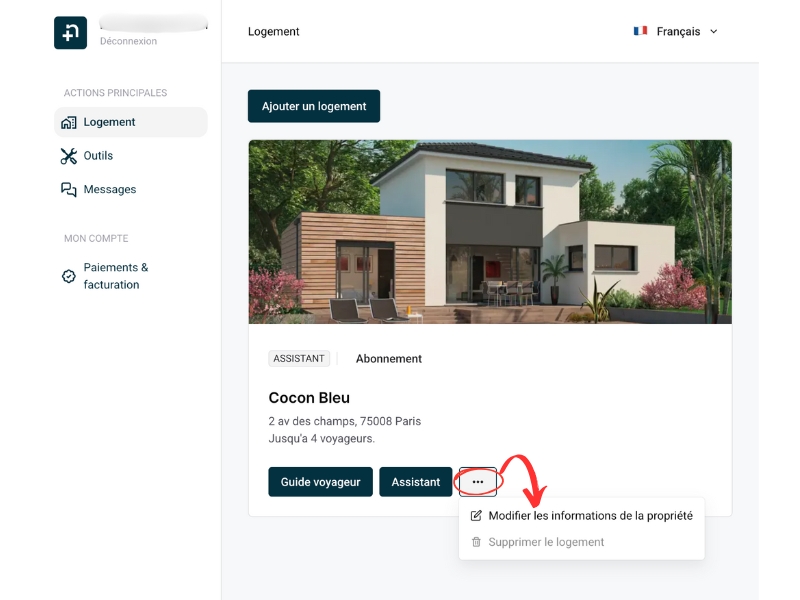 Ouvrez le logement concerné, cliquez sur les « … » puis sur Modifier les infos de la propriété.