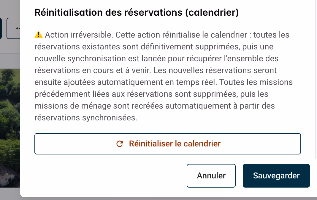 Si vous devez re-synchroniser toutes vos réservations (par exemple si une réservation est manquante), procédez comme ceci :