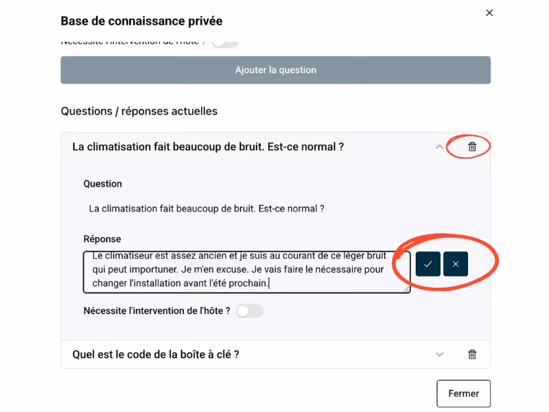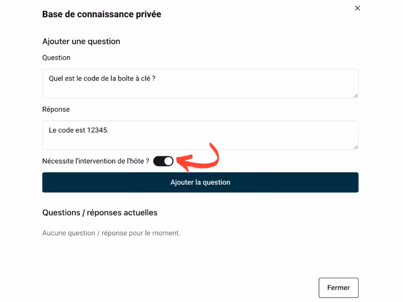 La base de connaissance privée est un outil stratégique : elle permet à votre co-hôte IA de répondre avec précision et cohérence sans divulguer des informations sensibles, conditionnelles ou confidentielles. Elle devient un véritable espace d'instructions internes, distinct du livret d'accueil, et vous donne un contrôle total sur ce que l'IA sait et ce qu'elle peut dire.