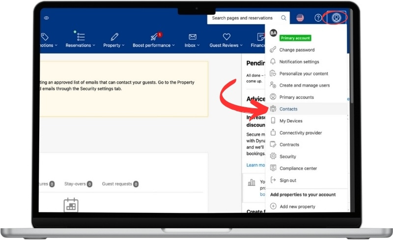 Log in to your Booking dashboard and go to your Profil. Then click on "Contacts"